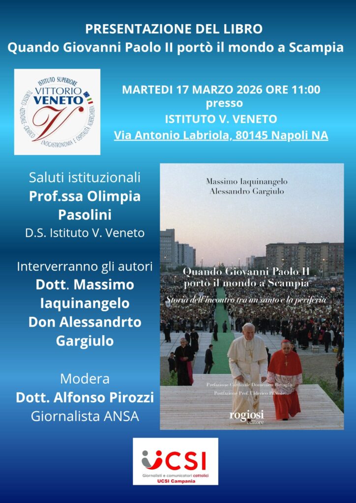 Domani, 17 marzo 2026 alle ore 11, all’I.S.I.S. “Vittorio Veneto” di Scampia diretto dalla Dirigente Scolastica Professoressa Olimpia Pasolini ci sarà una nuova presentazione del libro “Quando Giovanni Paolo II portò il mondo a Scampia. Storia dell’incontro tra un santo e la periferia”, scritto a quattro mani dal giornalista Massimo Iaquinangelo e dal parroco don Alessandro Gargiulo, edito Rogiosi Editore.