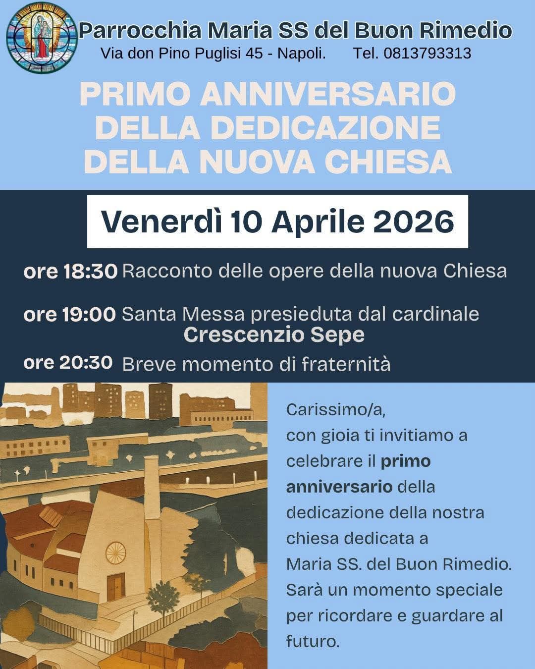 Un anno fa, nel cuore pulsante di Scampia, ha preso vita un nuovo punto di riferimento religioso e sociale: la chiesa di Maria SS del Buon Rimedio, dedicata ufficialmente il … Leggi tutto Scampia celebra il primo anniversario della nuova chiesa di Maria SS del Buon Rimedio